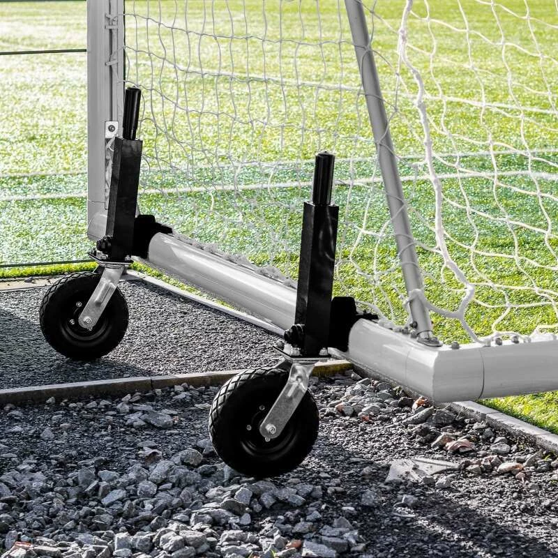 With two optional extras to pick and choose from, the performance of this premium quality 9-a-side freestanding soccer goal can be enhanced even further. For coaches and clubs who waste precious energy carrying their goal to and from the playing pitch, the heavy-duty lever type wheels will do the lifting for you. They feature a one-of-a-kind CAM mechanism, which eliminates manual lifting by raising the soccer goal up to a unrivalled 100mm off the ground. Extra wide with a deep diamond tread to prevent sinking into muddy grounds, the puncture proof soccer goal wheels provide optimal mobility.